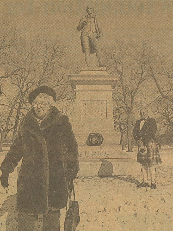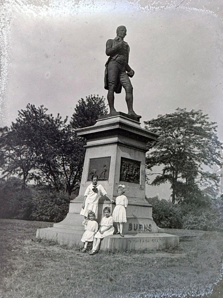 A Burns Memorial and Monument Association was formed in the 1880s to make the monument a reality. By the time the sculpture was nearly completed in Edinburgh, the association had raised almost enough to cover the costs of the monument, the equivalent of more than $350,000 in today’s money. Yet $3,000 remained to be raised, and the Scottish community’s male leadership of the time disagreed on how to close the gap. When fundraising efforts slowed, William Grant Stevenson stated he would not complete the work until paid in full. The committee’s director, Mrs. Robert (Elizabeth) Ballantine, visited with the artist in Scotland and arranged for payments to be made. The project may well have stalled were it not for the women of our Scottish Society, especially Elizabeth Ballantine, who stepped forward, cut through division, and carried the project over the finish line.