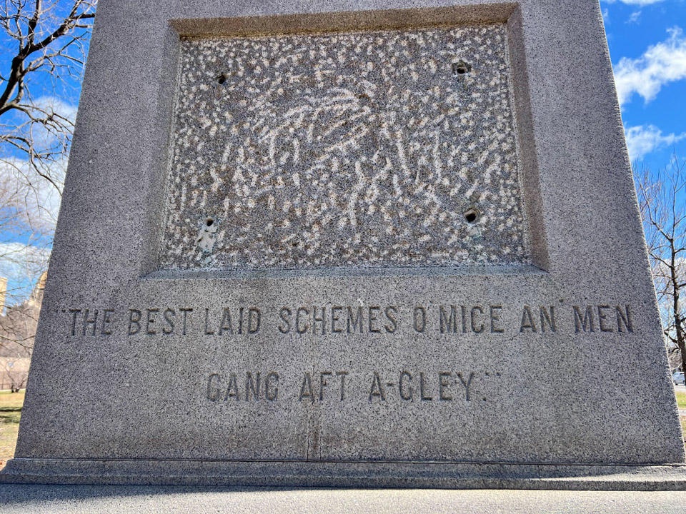 Willam Grant Stevenson made 3 other monuments in North America of Robert Burns (one in Milwaukee, one in Denver and one in New Brunswick, Canada). While the statues are identical, each one stands on a different pedestal. Chicago’s (which was commissioned first but dedicated last due to in-fighting among the Scots of Chicago) is the only one with 4 reliefs, New Brunswick has 3 (Cotter’s Saturday Night, John Anderson, My Jo and Tam O’Shanter), Milwaukee has 2 (Cotter’s Saturday Night and To A Mouse), Denver has none.